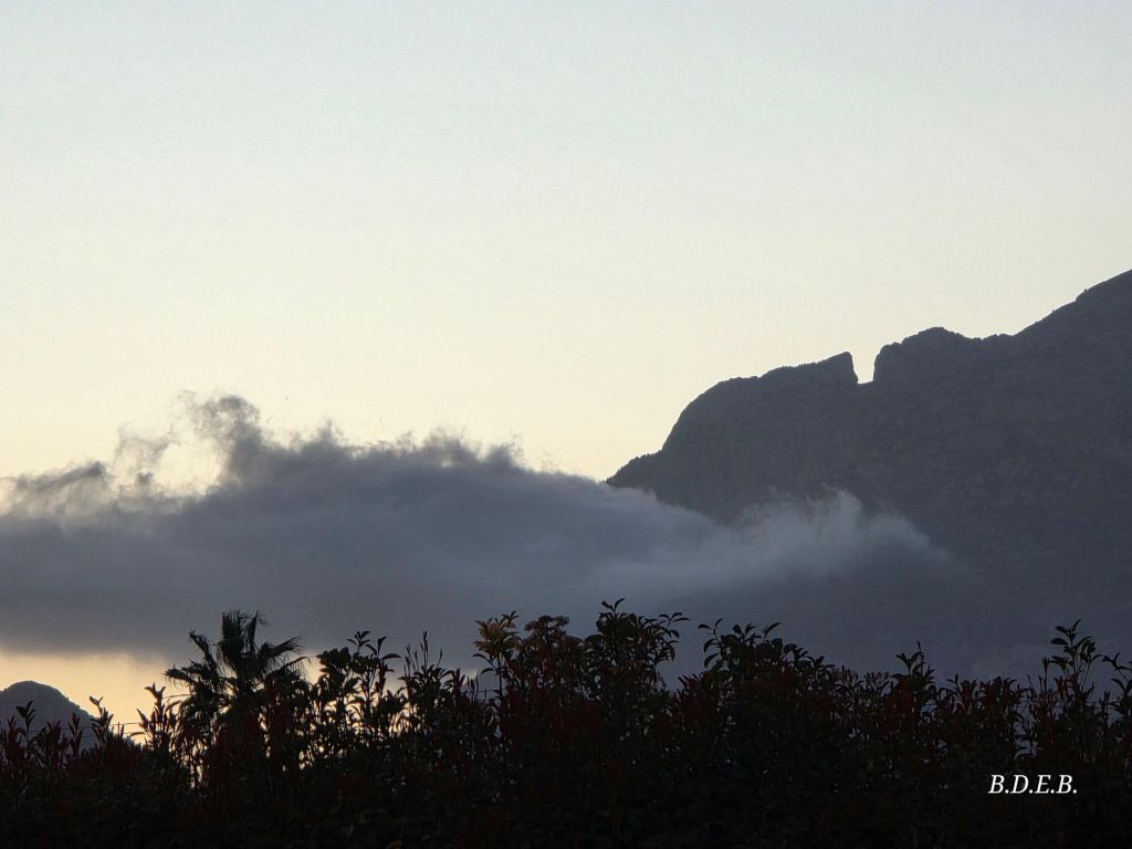 Una vez más un atardecer con el Puig Campana de fondo, con las nubes enganchadas a él como queriéndolas retener para que no estropeen los días de vacaciones.