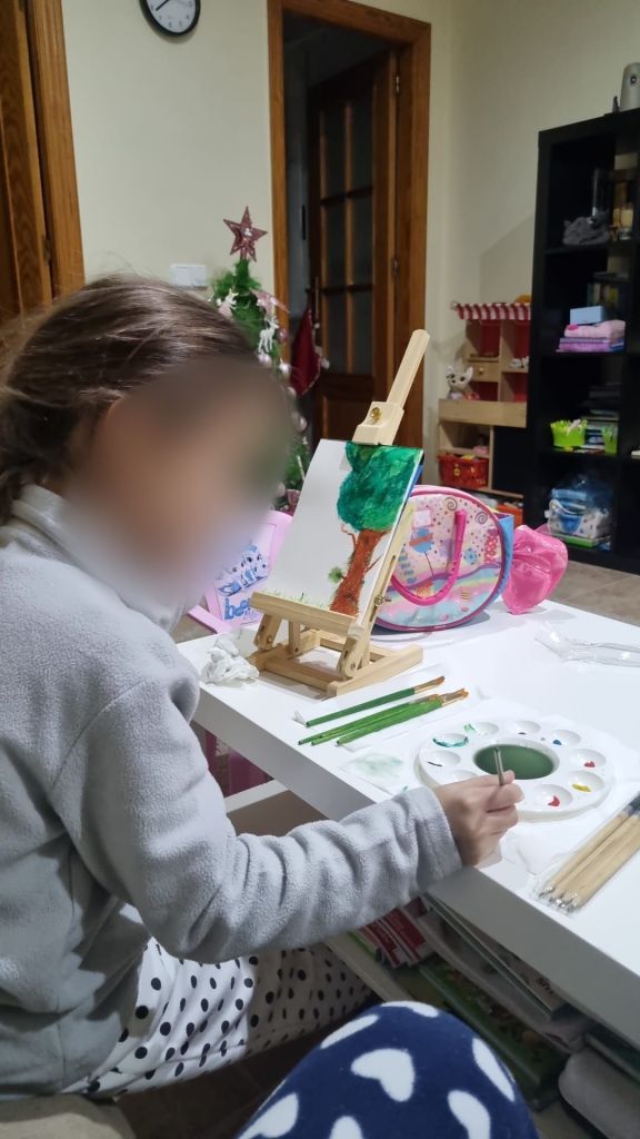 Y el día de Navidad por la tarde, ya en su casa, estrenó su regalo y su madre quiso compartir ese momento conmigo. Quizás algún día, en esa habitación de la que hablaba hace unas horas, cuelgue alguna acuarela de esa pequeña que tanto «arte» tiene.
