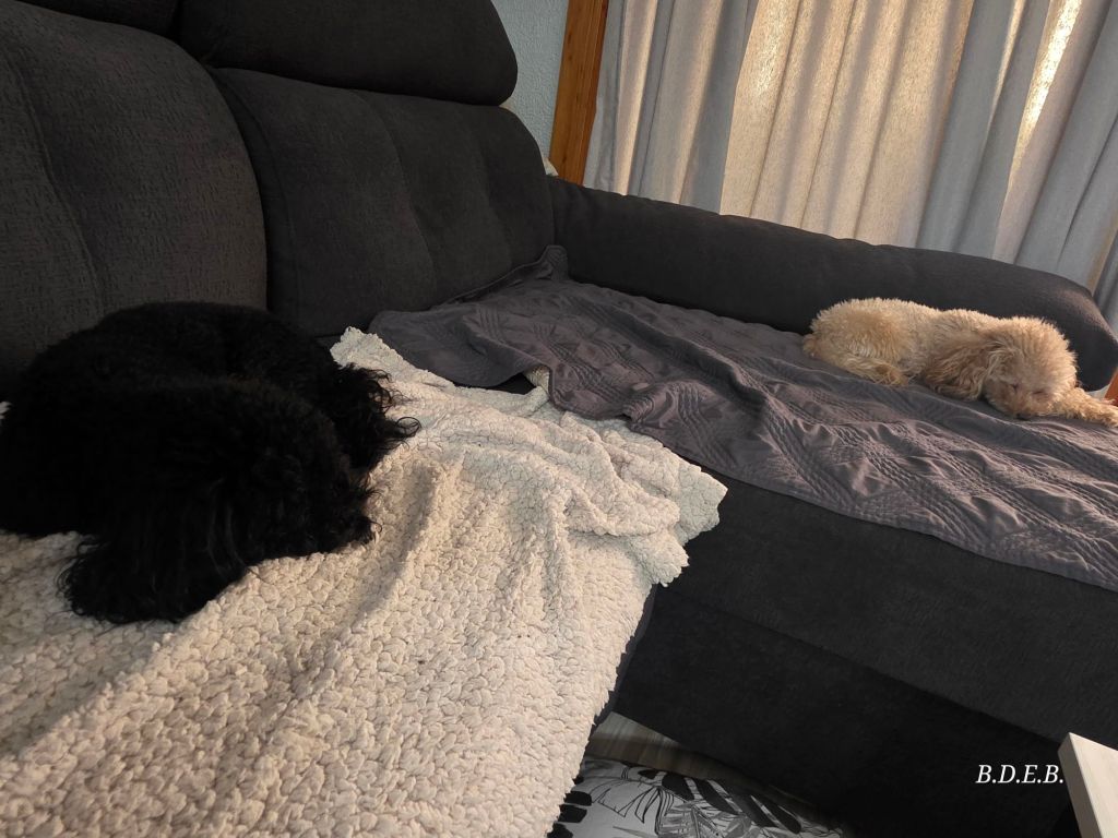 Ahí están, se han adueñado del sofá y la negrita hasta ha tirado el cojín al suelo porque le molestaba.