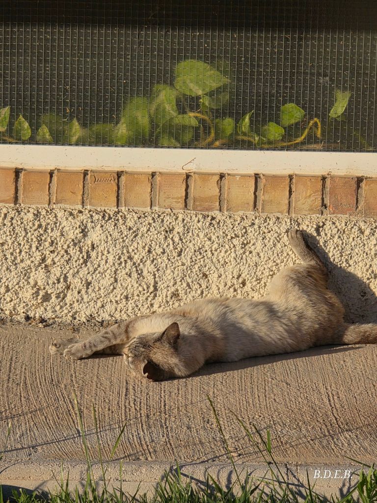 Sus compañeros le permiten acercarse, ella no va de «diosa», cuando está en la calle se convierte en una más de la colonia, no mantiene distancias con ellos, se acerca y comparten el césped del jardín para tumbarse a la fresca o se esconde como cualquier otro debajo de un coche.