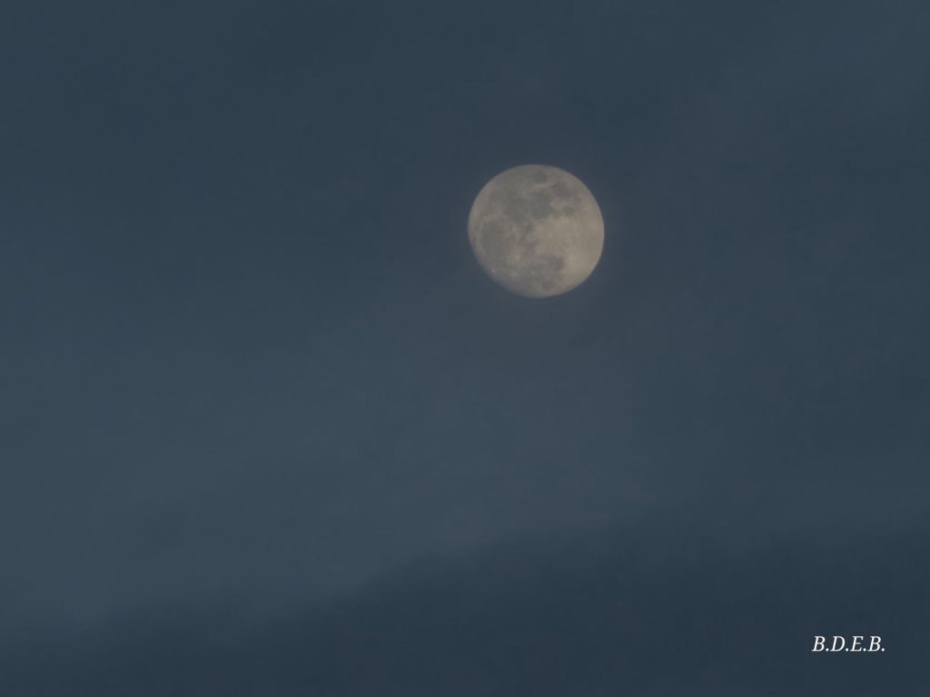 Casi llena y con las nubes cubriéndola, como si quisieran enturbiar su belleza. Aún así luce grandiosa, los primeros instantes antes de que el cielo oscurezca y aparezcan las estrellas para brillar junto a ella.
